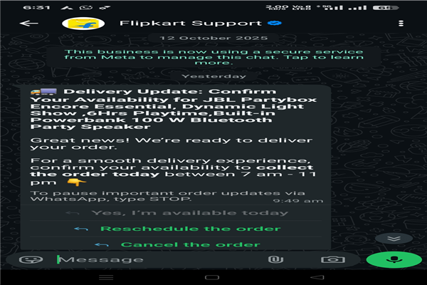 I have received a notification from Flipkart support they confirmed the delivery on yesterday 28-10-25, but they did not delivered. Again today 29-10-25 Flipkart support notify me that they will deliver it today, but till I have not received my parcel. I have called the local delivery agent they replied their delivery agent in my area is on leave and roughly call disconnected. My humble request to you please look into this matter as I am waiting for my order since 2days. This type of behavior of your delivery agent is not expected. Thanks